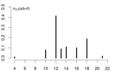 Here, the PMF is \pi_Y(a) = \begin{cases} 0.06 & \text{if } a = 10 \\ 0.43 & \text{if } a = 12 \\ 0.16 & \text{if } a = 14 \\ 0.08 & \text{if } a = 16 \\ 0.24 & \text{if } a = 18 \\ 0.03 & \text{if } a = 21 \\ 0 & \text{otherwise} \end{cases}