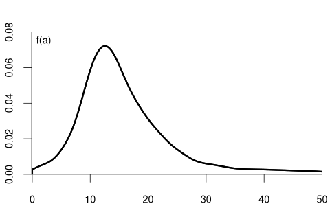 Suppose we want to estimate the experience density at a = 21 and consider the histogram density estimate with h=5. It is based on the frequency of observations in the interval [20, 25) which is a skewed window about a = 21.