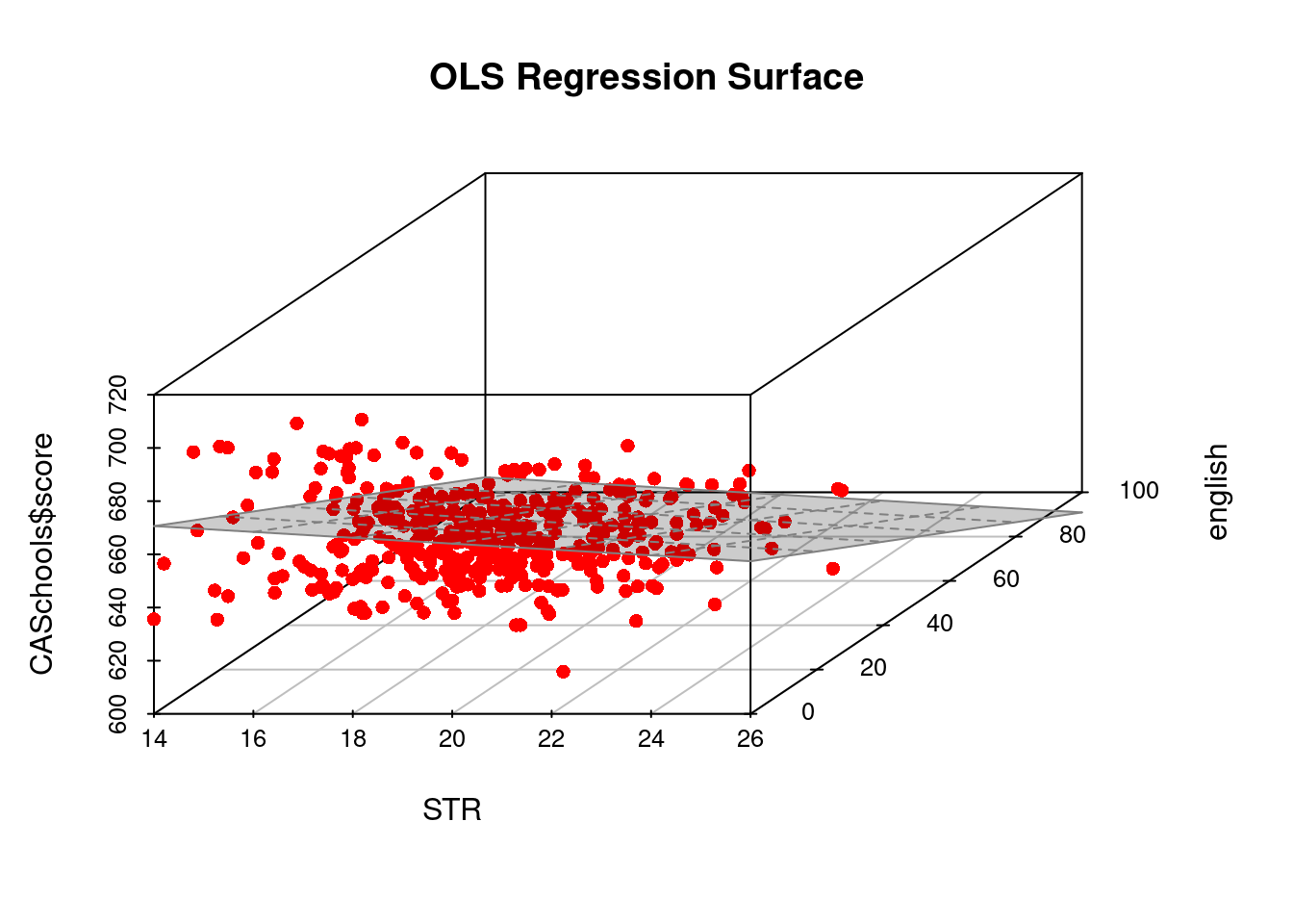 The fitted regression line now includes three predictors and four coefficients: 640.3 - 0.07 \ \text{STR} - 0.49 \ \text{english} + 1.49 \ \text{income}