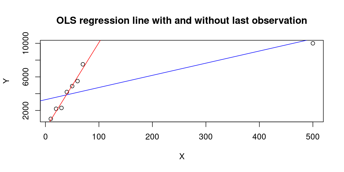 The diagonal entries of \boldsymbol P, given by h_{ii} = \boldsymbol X_i'(\boldsymbol X' \boldsymbol X)^{-1} \boldsymbol X_i, are called leverage values or hat values and measure how far away the regressor values of the i-th observation X_i are from those of the other observations.