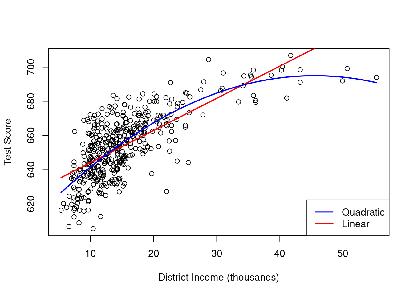 School districts with above-average income tend to achieve above-average test scores. But does a linear regression adequately model the data? Let’s compare a linear with a quadratic regression specification.