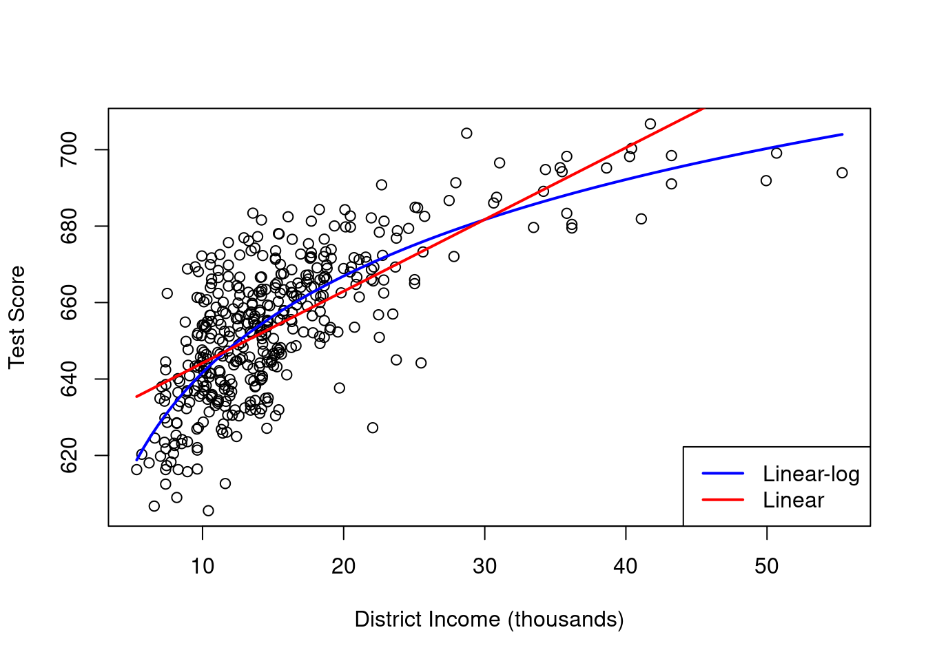 log(income)onscore: \frac{\partial E[\text{score}|\text{inc}]}{\partial \log(\text{inc})} = \beta_2. Instead, the marginal effect ofincomeonscoreis \frac{\partial E[\text{score}|\text{inc}]}{\partial \text{inc}} = \beta_2 \cdot \frac{1}{\text{inc}}, so \underbrace{\partial E[\text{score}|\text{inc}]}_{\text{absolute change}} = \beta_2 \cdot \underbrace{\frac{\partial \text{inc}}{\text{inc}}}_{\text{percentage change}}. Students from a district with 1\% higher income have on average 36.42 \cdot 1\% = 0.3642 points higher scores.