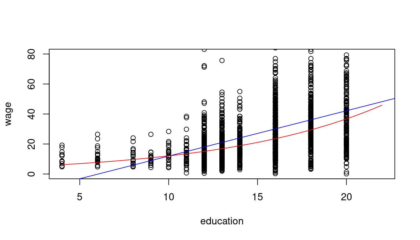 plot(wage ~ education, data = cps.as, ylim = c(0,80), xlim = c(4,22))