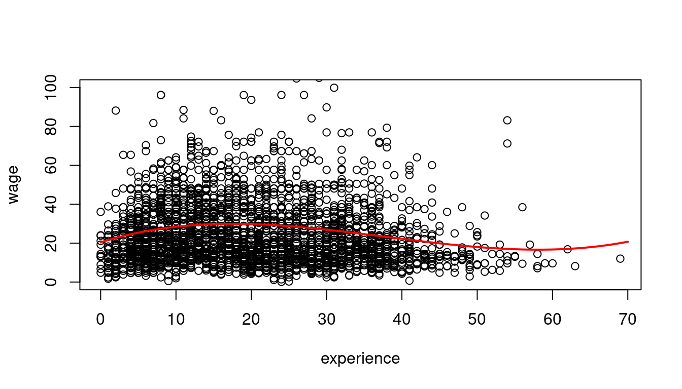 The marginal effect depends on the years of experience: \frac{\partial E[\text{wage}_i | \text{exper}_i] }{\partial \text{exper}_i} = \beta_2 + 2 \beta_3 \text{exper}_i + 3 \beta_4 \text{exper}_i^2. For instance, the additional wage for a worker with 11 years of experience compared to a worker with 10 years of experience is on average 1.2067 + 2\cdot (-0.0449) \cdot 10 + 3 \cdot 0.0004 \cdot 10^2 = 0.4287.