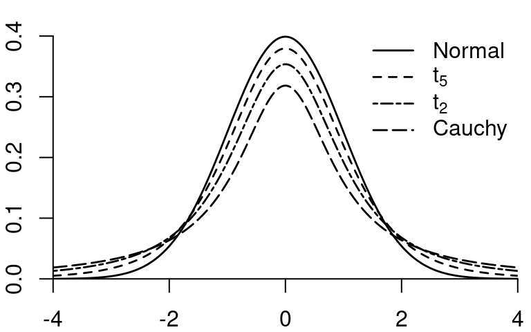 The t_m distribution approaches \mathcal N(0,1) as m \to \infty.