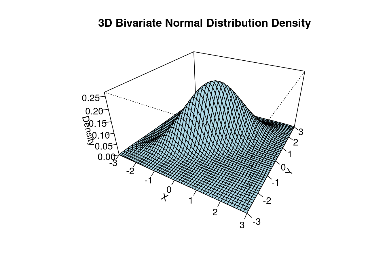 The 3D plot below shows the bivariate normal PDF with parameters \boldsymbol \mu = \begin{pmatrix} 0 \\ 0 \end{pmatrix}, \quad \boldsymbol \Sigma = \begin{pmatrix} 1 & 0.8 \\ 0.8 & 1 \end{pmatrix}.