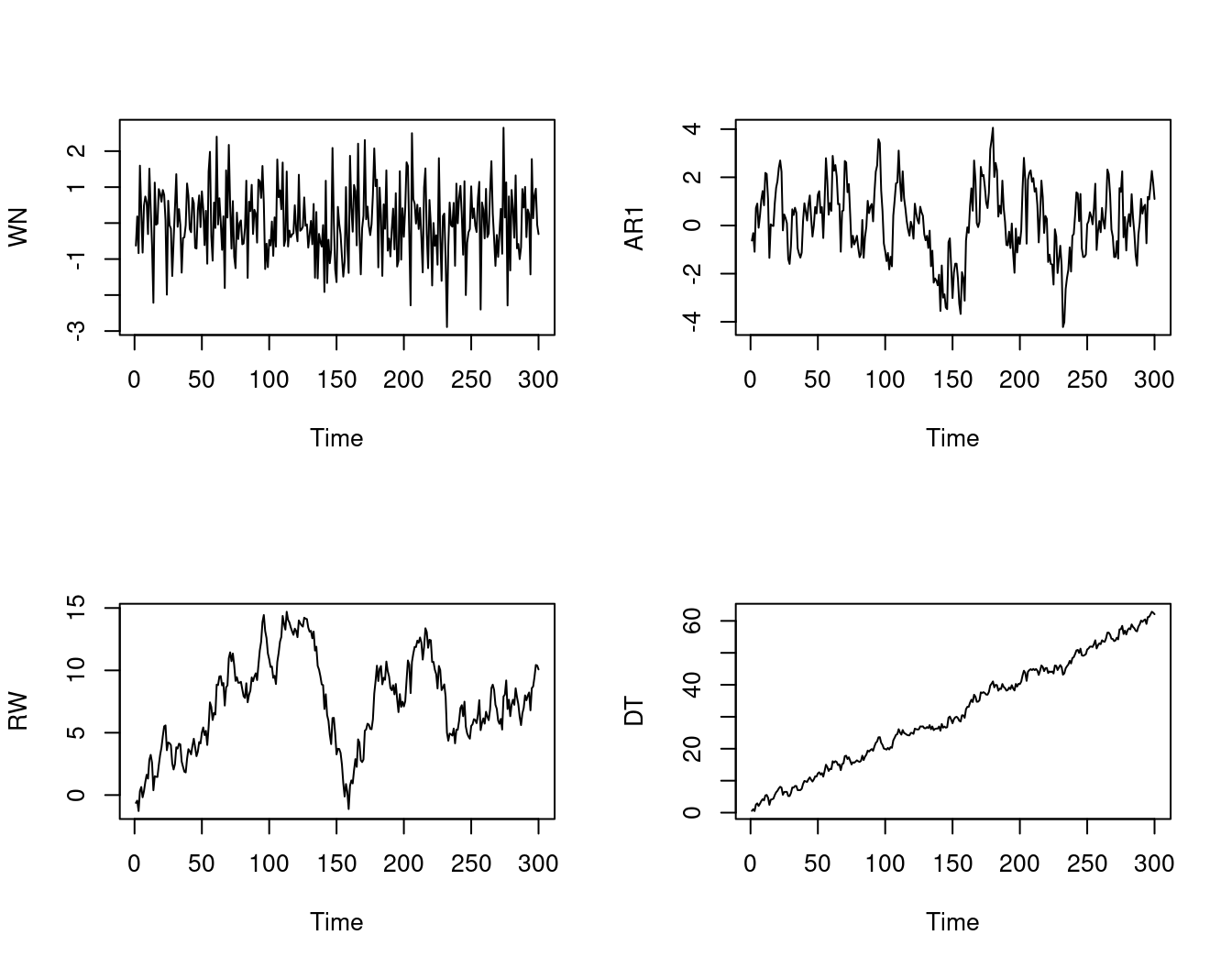 The sample paths of simulated white noise, AR(1), random walk and deterministic trend time series are shown below. The series shown at the top are stationary while the series at the bottom are nonstationary.