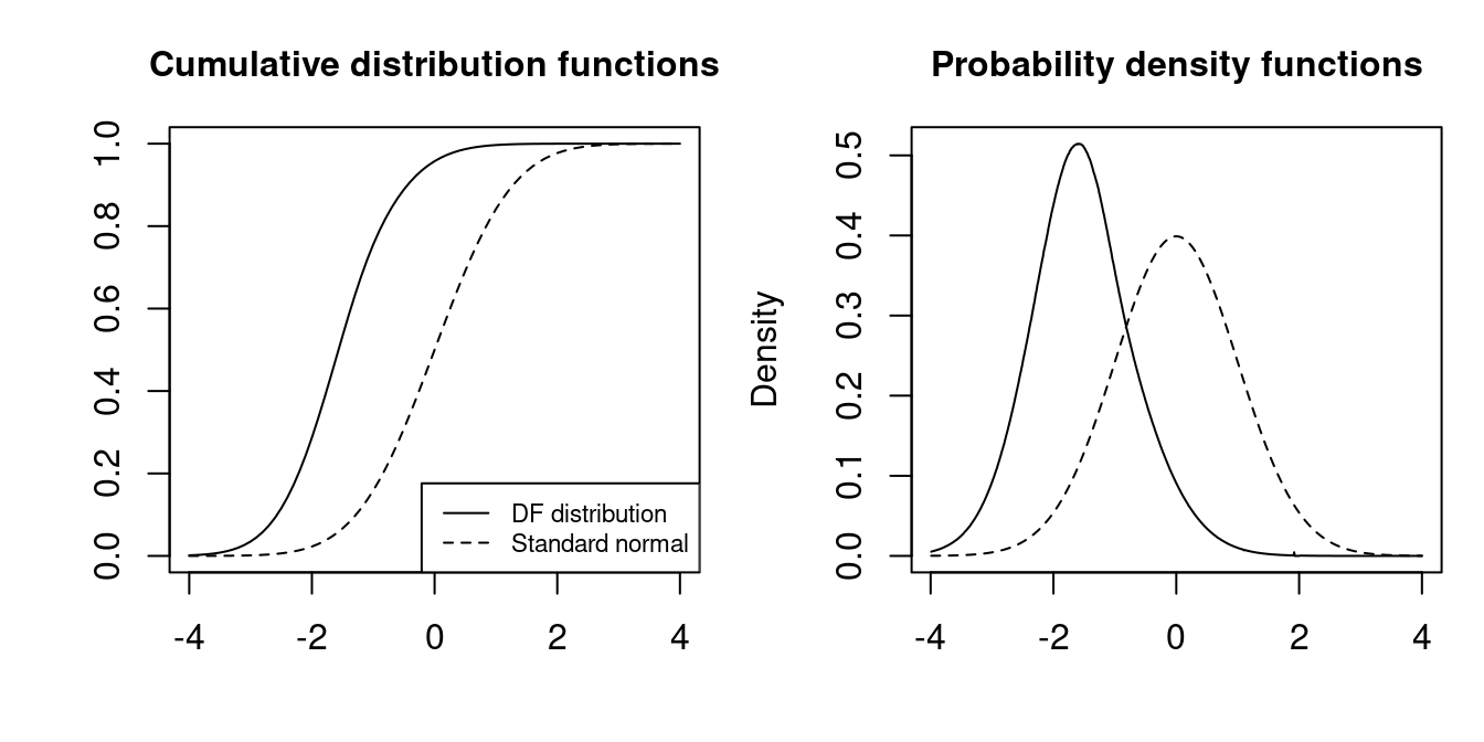 We reject H_0 if the t-statistic Z_{\widehat \phi} is lies in the left tail of the Dickey–Fuller distribution (is smaller than the \alpha quantile from the above table).