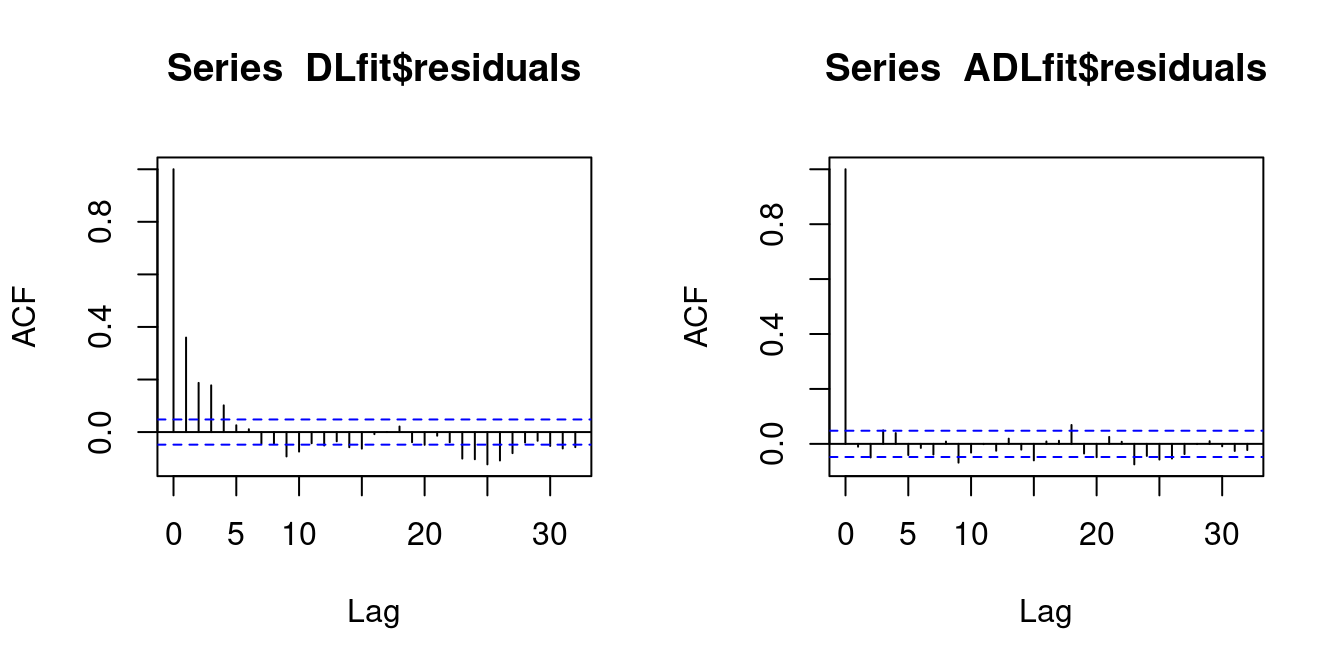 Thus, using HC1 standard errors seems reasonable for the ADL model. For the DL model, HAC (heteroskedasticity and autocorrelation consistent) standard errors should be used instead.
