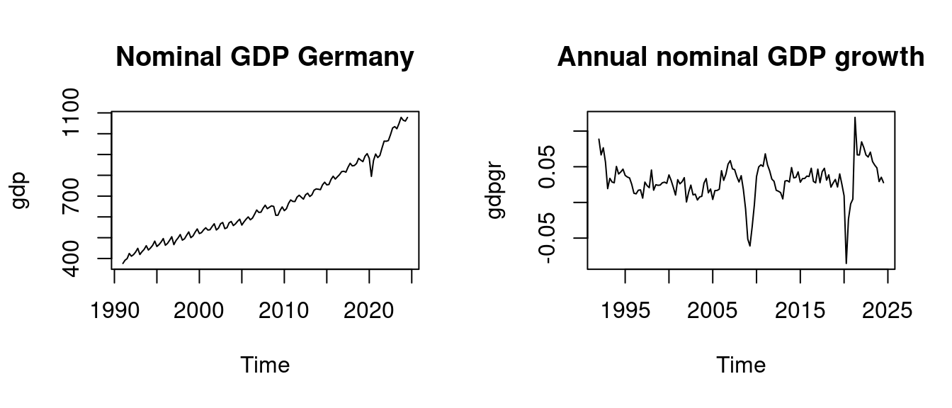 Consider the quarterly nominal GDP of Germany and its annual growth rate: