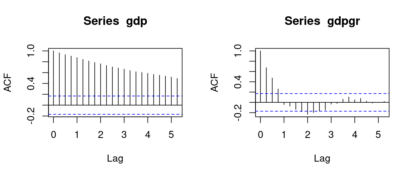 The ACF of nominal GDP decays very slowly and stays close to 1 for many lags, which is typical for nonstationary, trending series. In contrast, the ACF of GDP growth rates drops quickly.
