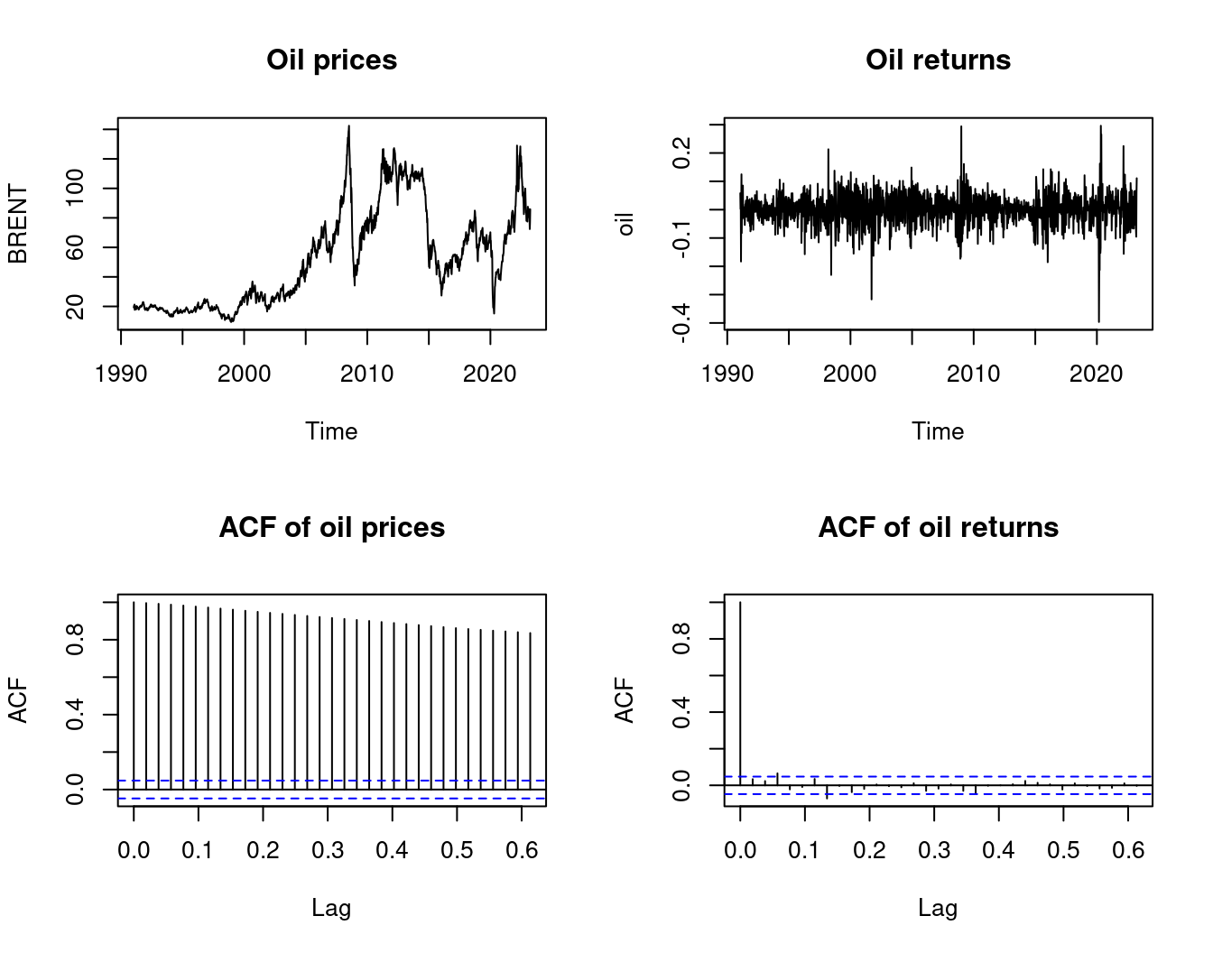 The oil price level shows very persistent correlation, while returns have an ACF that quickly shrinks towards zero.